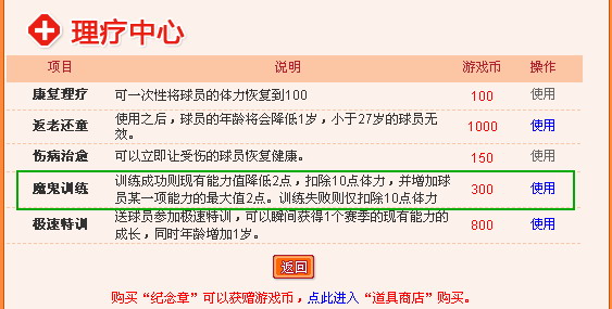 2.每使用一次魔鬼训练扣10个体力,体力降到30时不能继续使用。