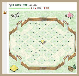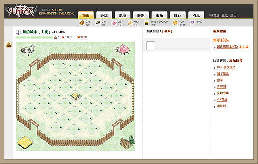 右下:城市面貌图,中心位置是一级市政中心,边上的方块空地用来建造新的建筑、木栅栏可以升级为城墙、箭塔和城堡