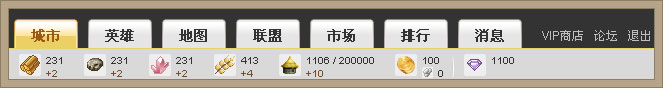 游戏中常用的主要功能按钮:城市、英雄、地图、联盟、市场、排行、消息
