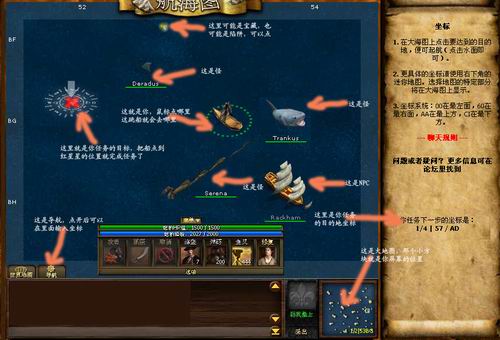 接的第一个任务的坐标在页面的右侧显示。你可以自己走,也可以点击左下角的导航图标,在X的地方输入横坐标,Y的地方输入纵坐标,然后点OK就可以不用理,安心去喝茶了。到了任务坐标,可以看到上图的那个特殊标志,把船点进去就完成任务了。开始的新手任务都是输入坐标然后点,很容易的。