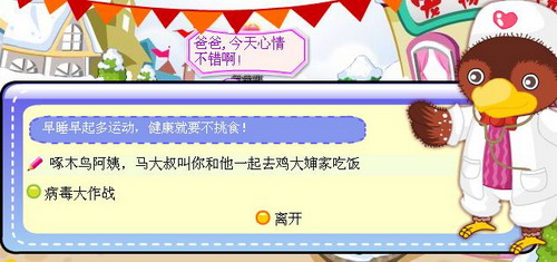 选择”啄木鸟阿姨,马大叔叫你和他一起去鸡大婶家吃饭“之后啄木鸟大夫会要求你去给鼠小姐带口信让她来复诊。