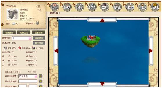 游戏的战略大图区。游戏最主要的操作区域之一。点击中间的小红房子就可以进入你的第一个领地,也就是新手村。你可以通过点击方向键看到中间群雄争霸的卡伦大陆,统一此大陆可以让服务器轮回。胜利国家将得到奖励。大家需要耐心等待这个界面的出现。或者多刷新几次,速度会快点。
