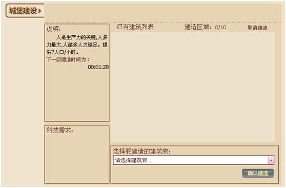 你可以看到自己的已有建筑列表是0/10,这0代表你当前的建筑数目,10代表的是你当前城堡的建筑上限,也就是说你一共只能建设十个建筑,首先要建设的就是银矿,农田和民居了,这三个的数目尽量要平均,因为实验室是必须的所以至少要留下一个空位,而还有一个空位是要留给召唤塔(需要召唤用于开拓分城的部队),剩下就是八个空位,所以至少是三个银矿,三个农田,两个民居,当然如果你觉得把所有的空位造满,等到需要的时候再拆除建筑也是可以的,当然你要计算一下按照你的在线时间是不是值得你这么做!