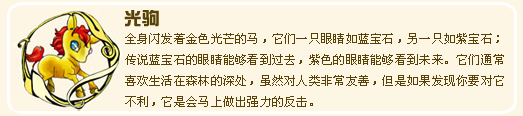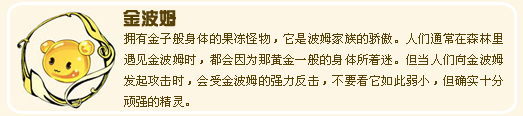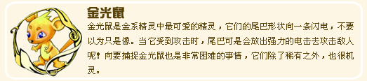 拥有金元素的精灵们,除了拥有强力的攻击力之外,还拥有操控雷电,令敌人晕眩的本领。它们金灿灿的身体总是带着迷人的光芒,令人着迷。火系宠物是它们的天敌,但它们对木系的宠物拥有强大的杀伤力。