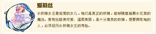拥有水元素的精灵们,虽然各项属性都很普通,但是它们拥有极强的辅助能力和恢复能力,能够在战斗中赋予自己更强的能力。此外,水系魔法也是它们的强项。但它们十分害怕土系的精灵们,但对于火系精灵却具有强大的杀伤力。