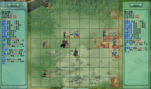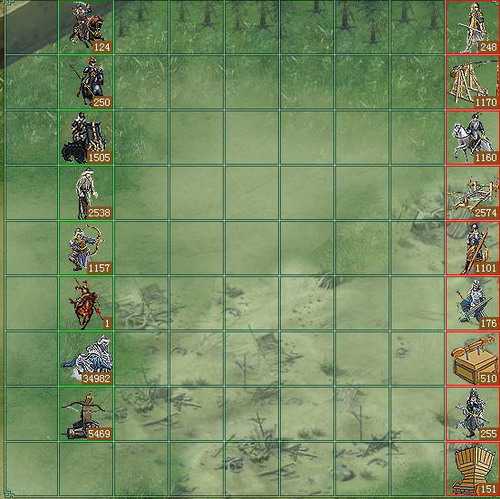 由于江南的三弓床弩,具有射程上的绝对优势,达到5格(游戏中唯一可以打5格的部队)且攻击输出也异常恐怖,为漠北最远程的工具车弩的2倍整,且可以早车弩(车弩射程为4)发起一次攻击。因此,江南的攻击战法非常明确:采用全攻战法,以三弓床弩为主力攻击点,凤凰弓手和铁甲井阑为辅助,在敌人靠近前,给予敌人最大的伤害。凤凰弓手是游戏中唯一射程4的弓手,由于所有的远程工具部队都是2回合攻击一次,故配置一定比例的凤凰弓手,可以在三弓床弩攻击的间歇,仍对对方的肉搏部队输出较大的伤害。霹雳车对建筑物的伤害十分可观,但是对人员部队的伤害只有50%。不明白为何攻击方会带上霹雳车,或许,他太自信了,认为自己能全灭对手,并砸掉对手的兵营吧?姑且,我们只能这么理解。轻骑兵拥有最高的战场速度,其作用就是最大限度的拖住对手肉搏部队的前进速度。禁军侍卫对付车弩类的机械效果不错,且攻防也都较高,可惜绝对数量太少,不足以抗衡对手的兽兵流;近卫戟兵也面临一样的问题,对付骑兵,近卫戟兵可谓绰绰有余,毕竟100%伤害加成足以藐视包括可汗卫在内的一切终极骑兵。但对手的主攻部队是兽兵,兽兵对步兵倒有50%的伤害加成。于是,攻击方克人不成,反被克,估计郁闷的要死。最后来说下猛火油柜,也是江南的王牌主力之一,虽然远攻伤害有限,进攻伤害也不高,但他对所有防御150以下的人员部队,有着100%的加成,而漠北的部队,普遍防御都在100以下。也就是说,这东西可以克制所有的漠北量产兵种。并且血量和装甲都很可观。