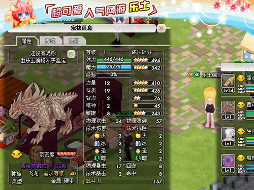 携带等级40级的西诺尔钢龙则是神兽之下最强的防御宠物,高体质、体力成长让它具有血厚防高的特点,能够牢牢的守卫在玩家身前,吸收来自各方的伤害。