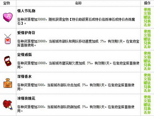 爱情护身符:各种资源增加20000,当前城市部队和商队移动速度加成5%,有效期1天。在**宝库直接使用。