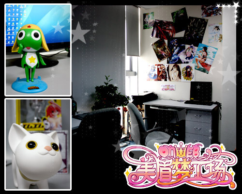 啦啦啦~~!这就是MM的主题办公室啦!可爱的门牌绝对能说明一切哈!~~打开大门,左手边就是动漫主题海报墙咯!相信所有接触过《美眉梦工场》的朋友,都不会怀疑MM所拥有的ACG血统吧?日式画风的精美游戏画面、别具一格的美少女养成系统、以前无所不在的“萌文化”元素,这一切都充分证明MM与动漫(ACG)的一脉相承!所有喽,动漫主题海报墙当然是办公室当中必不可少的一景啊!