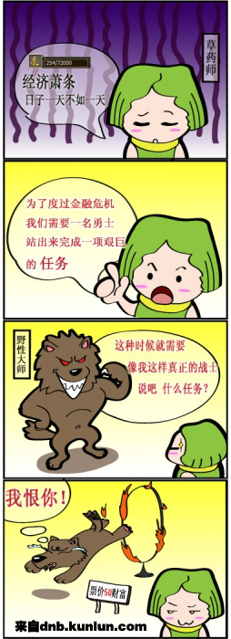 这篇作品中,漫画作者以现实中的热点话题金融危机作为背景,描绘了《龙与乡巴佬》游戏中橡木隐士会的成员们(聪慧的药草师与威猛的野性大师)是如何应对金融危机的。这也充分体现了游戏中的终极职业野性大师的“彪悍”。
