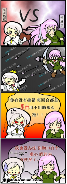 此次,我们的四格漫画作者开起了圣光教会中光明祭司的玩笑。在《龙与乡巴佬》中,橡木隐士会的巡林卫拥有“狙击”的技能,可以使巡林卫有20%的概率对敌人造成额外55%的伤害。而光明祭祀胸前的十字架不巧成了“众矢之的”。