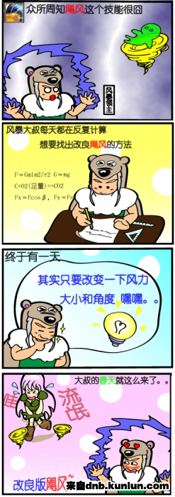 呵呵,这篇四格漫画略显邪恶,可见我们的漫画作者也是一名男性玩家吧。不过这幅作品还是很应景的,刚好现在我们已经迎来了“养眼”的季节(小编也露出了邪恶的本性)。橡木隐士会中的终极职业风暴领主大叔竟然对同一势力下的巡林卫美眉下手……玩家们在游戏中可千万不要模仿啊。