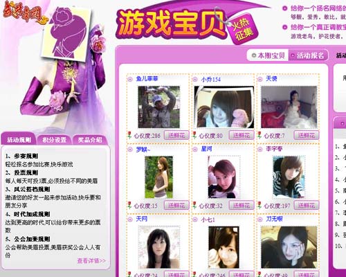 来到该活动的网页,可以看到参赛的MM都需要上传自己的照片,游戏玩家可以通过“献鲜花”的方式来增加该MM得分。一位名叫芸儿的MM参加了这个活动,据芸儿介绍,该活动不只是简单的网友投票,要想获得高的排名,可以选出一位教官来和MM搭档游戏增加积分。