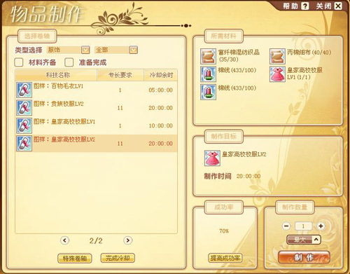做LV2的衣很容易失败的说。我做了5次LV2才做出来,一次需要20个小时,5次就是100+个小时啊!!~ 555~LV2的成功率70%,怎么到我这儿就……,也许是我RP问题吧。~