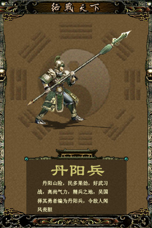 丹阳兵可以说是前三国时代天下闻名的精锐。当年徐州牧陶谦就靠着丹阳兵成为讨董十八路诸侯之一。可惜当年陶家丹阳军的统领竟是曹豹(草包)将军,白白玷污了这支军队。果然只有如小霸王孙策这样的将领带着,才能开疆辟土~