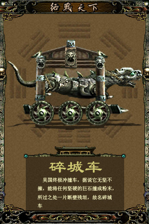 机工方面吴虽不如魏蜀般巧匠百出,但舟楫产地又岂会无善匠作之人?这台吴国特产的碎城车就能把坚城破一个大洞。当年诸葛恪攻新城便是此物建功,可惜为人所诈以至功亏一篑,殊为可恨。