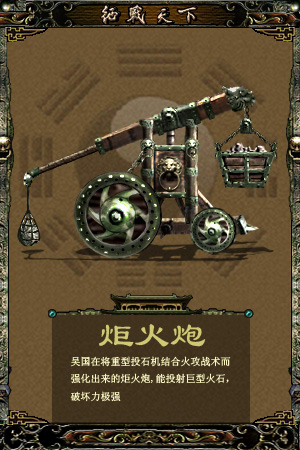 吴军之利首在水军。《征战天下》既推水战,自然少不得楼船利器。炬火炮就是传说中凌驾于巨弩之上的超级兵器,水陆两用,可置车轮,可固定,炬火碎石一出,便是坚船巨城亦可一触而破!