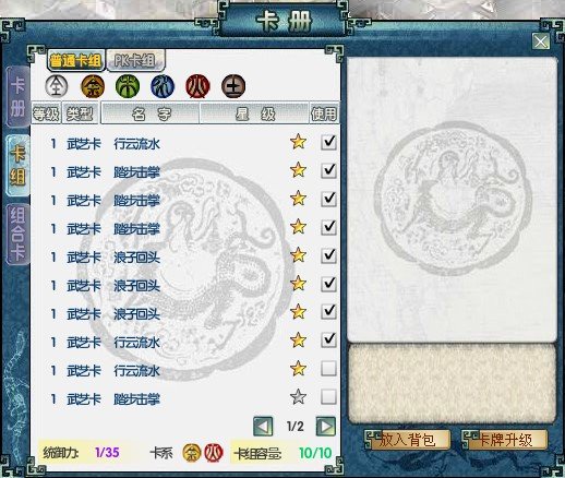 卡牌可以分组,打开卡册的窗口会显示卡牌的种类,每张牌后面有一个“口”。在“口”打个勾就可以把卡牌编入当前的战斗组了。游戏中卡组分为两种,一种是普通卡组、一种是PK卡组,打个比方:打怪的时候系统会默认出普通卡组,如果是PK的时候则会默认出PK卡组,当然了,前提是要你有将相对应的卡组装备卡牌。