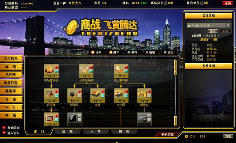 首款免费创业网游《商战飞黄腾达》虚拟的世界里,每一位进入游戏中的玩家,都将直接拥有属于自己的公司并担任公司CEO,负责整个企业的发展与壮大.游戏分为两大主要特色,商业建设和商业战争.玩家可以首先建立营销部、公关部、资金部、总经理室等部门,以此来扩大公司的规模,稳步发展从而盈利.而喜欢商战的玩家,则可以前期就花出大量资金招聘各种各样的人才,并派遣这些员工开启商战来打击对手,抢夺对手的资金、员工甚至人脉,从而发展公司整体实力.此外,《商战飞黄腾达》还加入了很多不同有趣的特色,商盟、银行等设定让玩家体验前所未有的创业快感!