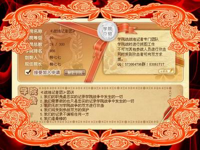 如此火爆的学院战争场面,当然需要有人来忠实地记录与还原,将来自现场的第一手资料真实地呈现在广大玩家面前!于是,《美眉梦工场》ID为"纳西糜糜"的玩家,凭借自己的热情,在s8服"誓言平原"率先成立了一个战地记者的组织、一所特殊的学院--≮战地记者团≥!招募那些自愿在学院战争当中,通过截图和文字,对战争实况进行报导的玩家,组成一个专门的记者团.