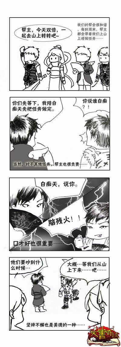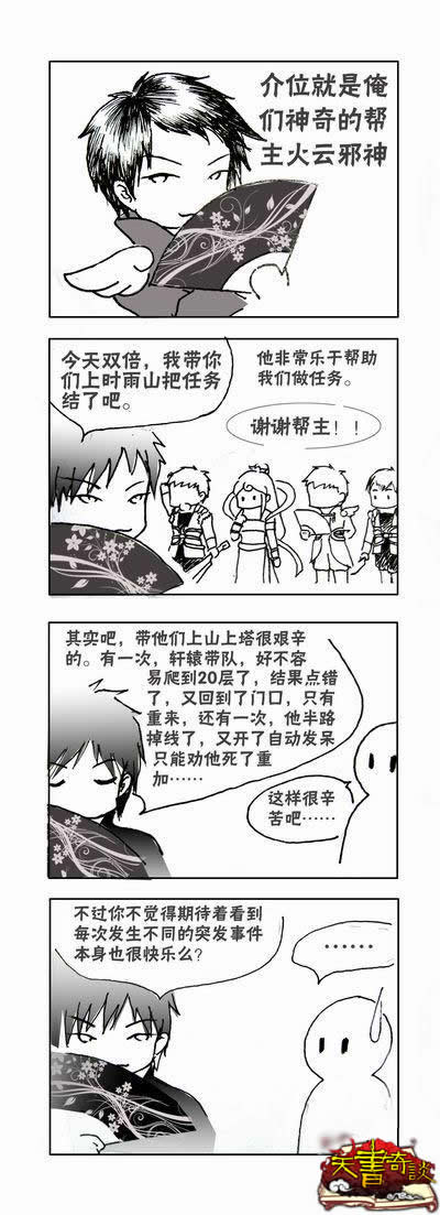 三百六十五行,行行出状元,只要用心体会,玩游戏也能成为大明星.年度最佳网页游戏《天书奇谈》,生动的游戏内容激发了无数玩家的灵感.自漫画才子"轩辕翌日"首发四格连载《倒霉孩子小分队》后,在玩家中引起了强烈的共鸣,他的忠实粉丝迅速增多.如今才子轩辕的第二部四格创作火热出炉,《我们帮会我们帮》生动描述了妙趣横生的帮会生活,粉丝们又可以大饱眼福啦!