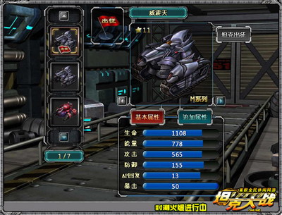 坦克是坦克兵的最爱.拿了金币第一时间自然买坦克了.牛魔王、玄武、蜘蛛侠都是只能用金币购买的坦克.牛魔王是M系列中最好的,攻击力十分突出,是个好打手,模样也很牛.玄武作为H 系列,血厚耐打,其他属性也不差,而且外表华丽,很养眼.蜘蛛侠最为A系列的坦克,能量充足,AP回复快,移动速度位于所有坦克之首,造型也很另类,是仿生学的杰作.