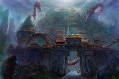 玄天湖,三仙岛的主城.此处住着的是一群与世无争、法术高明的仙人,所以画面设计以天空为背景,凸显世外仙人的飘逸与自在,用繁茂植物来暗示这里是灵修之地,建筑则走规整布局的皇城宫殿派,体现了仙家出身高贵的本质,整体用色淡雅明净.