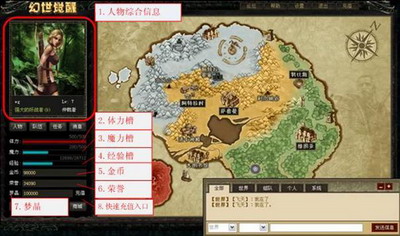 每次进入游戏后,首先看到的是包含登陆之前数条聊天信息的游戏聊天窗口,以及《幻世觉醒》的世界地图.点击聊天窗口的减号按钮将它最小化后,此时展现在你面前的才是游戏的初始界面