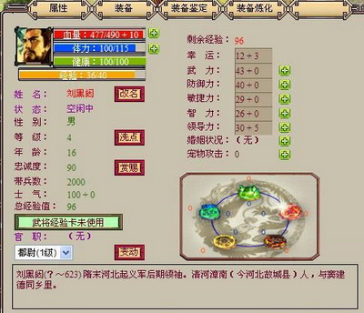 武将:磨刀前得先确认刀口是否善磨.所以在选择发展某一武将前得挑选一名属性上等的武将,起始属性高、武将天赋异秉的传奇武将更是可遇而不可求,多去酒馆溜达下是为明智之举.