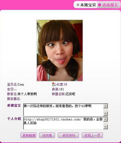 《武林帝国》游戏快乐宝贝第二期活动从6月10日开始至今,已经吸引了数百名游戏内的MM加入评选。众多宝贝齐齐亮相,让人目不暇接。其中有一位非常特别的Cora同学不走寻常路,以恶搞的形象与大家见面。很多玩家都对这名搞怪MM很关注,还有传闻这位宝贝是TAOBAO的美女掌柜,记者若若现在就去采访这位MM,以满足大家的好奇心。
