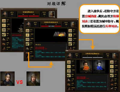 当攻守双方官职相差2级以内,即可发动攻城国战。进攻方出征须带齐粮食,否则无法出征。因为军队、兵种、器械都需消耗粮食。就像短板决定木桶的容量一样,在《叱咤三国》中,进攻过程时的行军速度,是由军队中最慢的兵种速速决定的。发起进攻后,如果守城方武将出城迎战,那么进攻方的武将必须迎战;如果守城方武将留守城市,那么进攻方必须破防进城后,才能与守城武将决斗。
