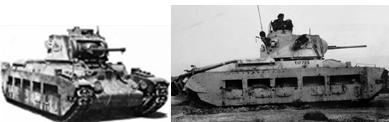 马蒂尔达 II步兵坦克1939-1945年间在不列颠军中服役,是自始至终都参加了世界大战的着名坦克。说马蒂尔达 II是一种全新的步兵坦克也不为过。马蒂尔达 II型坦克的特点是,炮塔上装上了2磅火炮,行动部分有侧护板和排泥槽,各部分的装甲厚度也得到增强,而且一些部位采用框架式结构,增加了刚度。在内部结构上,马蒂尔达 II坦克还有一个特点是采用了2台发动机,当一台发动机损毁或出现故障时,靠另一台发动机可以低速行驶,保持一定的战斗力。其行动部分的特点是采用了平衡式悬挂装置,另一个特点是履带外侧有侧护板及排泥槽。在阿拉曼战役之前,它是不列颠军第8集团军装甲兵的主要装备。其对摩托化步兵有较大的打击制约作用。