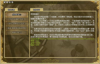 《海洋时代》的任务系统简单明了,但是内容充实,涵盖了所有游戏中的行动操作以及升级建筑和科技的次序。其中阶段性的任务有2种,一是国王赏赐爵位的任务,一是升级码头广场的任务。前者需要通过完成任务,探索新港口,以及商业投资等游戏活动积累足够的荣誉,后者则需要一定数额的游戏货币。这两种任务都需要玩家付出一定的努力才能达到,一步步攻克这些阶段性目标,使玩家体验到自己的进步,从而获得极大的成功感和喜悦感。