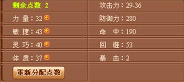 玩家升级之后,会有两点的自由点数可以分配,点击人物按键,你可以把自由点数分配给伤害相关的力量、闪避相关的敏捷、命中相关的灵巧、生命防御力相关的体质。如果对自己分配的点数不满意可以选择“重新分配点数”。