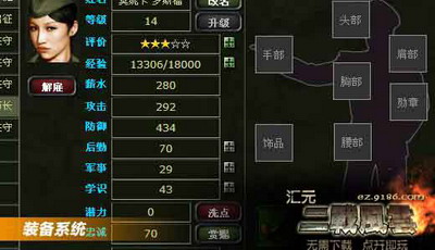 装备系统主要是针对游戏中的军官所设置的,装备可增强军官的各个属性,每个军官共有9个装备位:头部、肩部、胸部、手部、腰部、脚部、勋章、饰品、配件,不同的装备提升军官的各属性,从而使军官更具有统领能力。