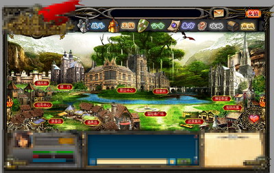 由图可看出整个游戏界面是充满着浓郁的欧美风格奇幻味道的,十分华丽,操作界面也被分割的简单明了。上方一目了然的主菜单栏分成了战斗、王国、公会、集市、攻略、商城六大板块,并且用各种具有代表性的图标和不同颜色的字体做了标记,更方便了玩家的操作。