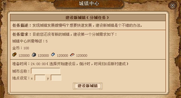 在确定好坐标和城镇名之后,玩家的分城即宣布开始建造。玩家的分城会在24小时之后建造完成。