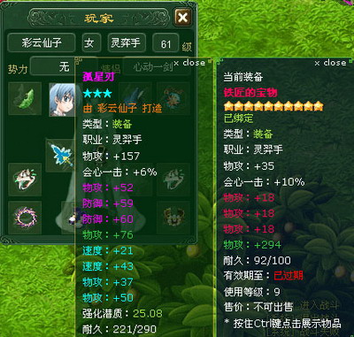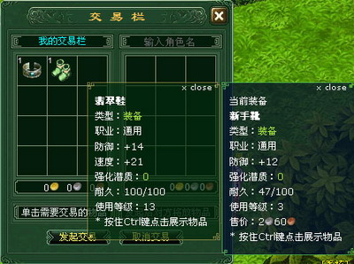 当玩家在鼠标移动到装备类物品图标上时,系统将自动搜索玩家自己身上已经穿戴了的相同类型的装备,如果有就将两个悬浮提示信息同时显示出来,如果没有装备同类型装备则不显示。玩家将可随意与自身的装备进行对比,可对比的装备包括:其他玩家身上装备、背包装备、仓库装备、NPC店出售装备以及其他玩家摆摊出售的装备。而且,玩家在聊天栏中展示出的装备,用鼠标点击后也会进行装备对比。