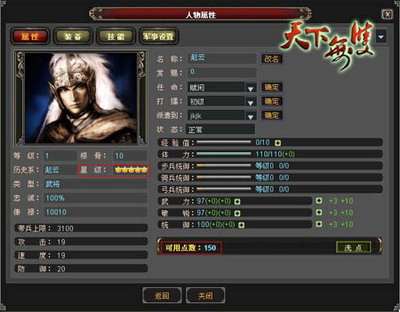 500多名三国历史着名的谋士与武将、俊郎与美人收录在《天下无双》的名将谱中,同时,“将领转生”系统即将上线!由我易网络制作运营的三国战争策略类网页游戏《天下无双》,打破了目前市面上三国类游戏名将属性的限定,名将转生系统之所以如此突出,并不仅仅在于它的等级层次和属性,而且还可进行五次转生,有机会让普通名将通过“易筋丸”转生为高级名将,打造专属于你自己的超级名将!