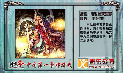 农历六月初三日,是韦驮尊天菩萨圣诞日。对于《神魔令》玩家来说,也是个幸运的日子,在这一天,韦驮尊天菩萨将降临王舍城,每一位《神魔令》的玩家都将受到护法天神的赐福。为了纪念这位伟大的护法菩萨,以中国古典神话为背景的中国首款卡牌对战网游《神魔令》特别增加了一张“韦驮尊天菩萨”新卡,护卫王舍城中的黎民百姓能够安居乐业远离战乱。