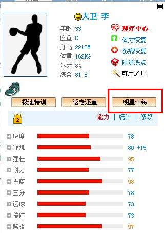 1、进入球员属性页面,点击“明星训练”按钮,进入该球员的训练页面;(如图)