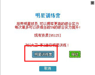 2、训练球星需要消耗一定的“资质”,当您拥有足够的“资质”时,点击“明星训练营”按钮开始训练;如果是对训练不满意,点击“降级”可以对该球星,进行降级操作。(如图)
