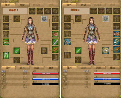 人物的外观效果变化主要体现在两处,一处是人物属性界面的显示,另一处是人物在游戏中的实景显示。要让人物的外观产生变化,就至少要集齐6件同一颜色的装备,也就是游戏中的绿装、蓝装等等。白装除外,作为品质最低的装备,白装不产生外型变化效果。