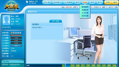 玩家进入打开新版的游戏界面图,进入我的办公室就可以看到如图1界面,魅力出众气质非凡的秘书便会出现在你的视野当中,窈窕多姿的美女秘书是不是已经让你心动?画面看起来不是很像你刚刚走进办公室,秘书迎面向你走来?