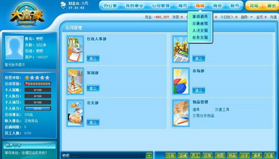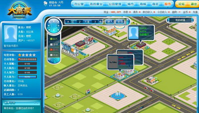 《大富豪》在界面布局上采用更合理人性化的布局,左侧全部显示玩家属性资料信息,轻松尽收眼底,上放是游戏的功能按钮,采用的是FLASH制作,只要鼠标轻轻一碰,就会展列出下拉菜单列表,各项功能选项任你体验。