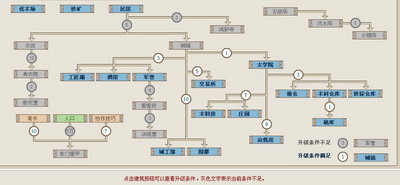 树状结构自上而下表示每种建筑物建造完之后,可再建哪些建筑;也表示每种建筑建造的先决条件是什么。目前暂时无法建造的建筑物,其按钮在该界面上,呈灰色显示。鼠标移动到任意一个建筑框上,都会有一个悬浮框显示该建筑物的当前等级,以及升级到下一级,本城需要再积累多久的资源。其中已经满足的条件为绿色,未满足的条件是红色。