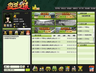 同时《疯狂足球》为方便喜欢打比赛的玩家能随时进行绿茵角逐,对版面也进行了调整,玩家联赛、系统联赛、自建杯赛、世界杯、升级挑战赛、挑战经理人等等一系列的个性化系统功能,全集中在一个界面之内,极大的方便了玩家的操作