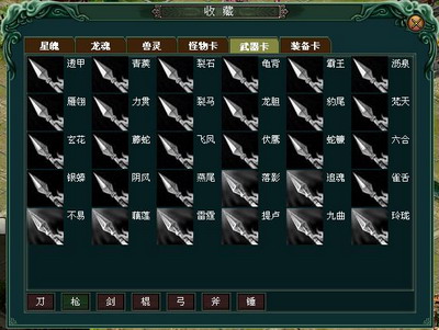 武器卡。在人物装备栏中选择武器,进行封印操作,玩家即可将获得的武器封印成卡片。封印有一定的成功概率,低等级的武器成功概率较小。无论成功与否,玩家试图封印的武器均会消失,而封印成功则得到一张卡片。卡片将出现在藏品系统武器卡一栏中。武器卡主要有七种,包括刀、枪、剑、棍、弓、斧、锤。每种武器卡各有三十张,每成功封印一把武器,藏品系统中便多出相应的一张卡片。