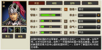 身为战国四大名将之一的李牧治军有方、爱兵如子,在为赵国抗击匈奴及抵御秦国的战斗中都发挥了重要的作用。李牧的技能是“突击”,技能发动的单位兵种必须是骑兵系,骑兵的高机动性使其在战场上的移动范围远高于步兵和弓兵,当李牧麾下所属战斗单位均为骑兵时,无疑将成为游走于战场的中坚力量和超级DPS队。