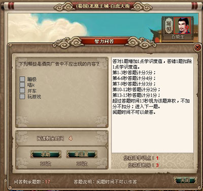 智力答题系统用于获得学识度值,并通过答题获得积分来换取经验。